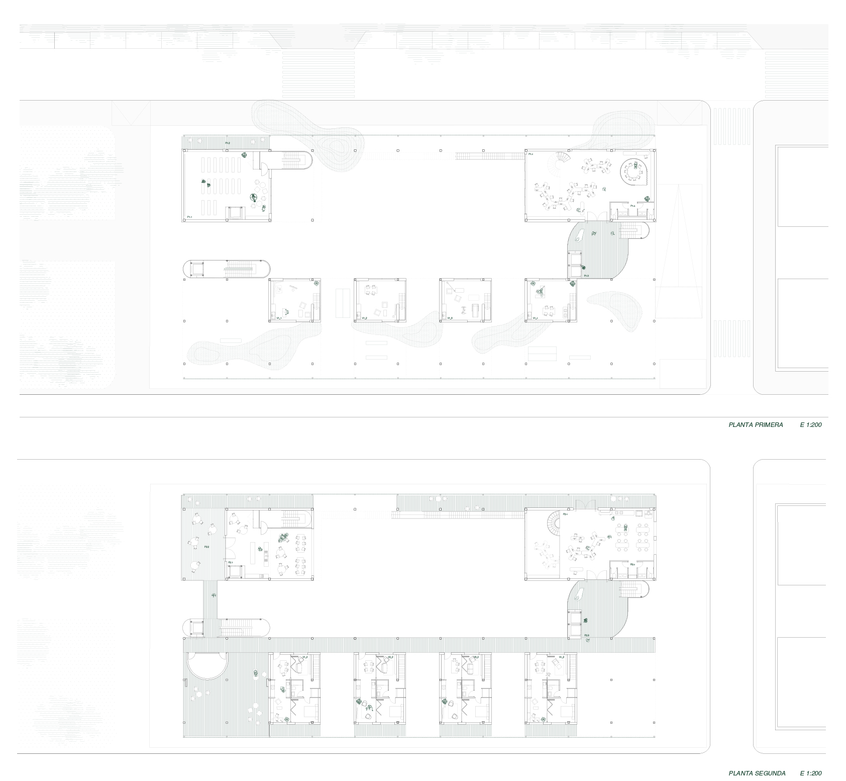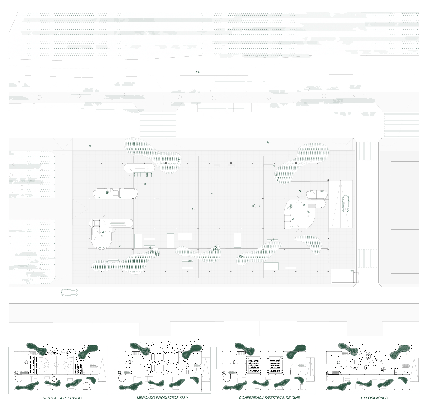 La planta baja del proyecto se plantea como un espacio libre, propiciando la continuidad del espacio público del parque al interior del conjunto creando zonas verdes que incitan a la introducción de las personas a adentrarse al gran espacio central donde permitirá acoger distintos escenarios como mercado de productos de los huertos del Parque Miraflores, convenciones, cines de verano…