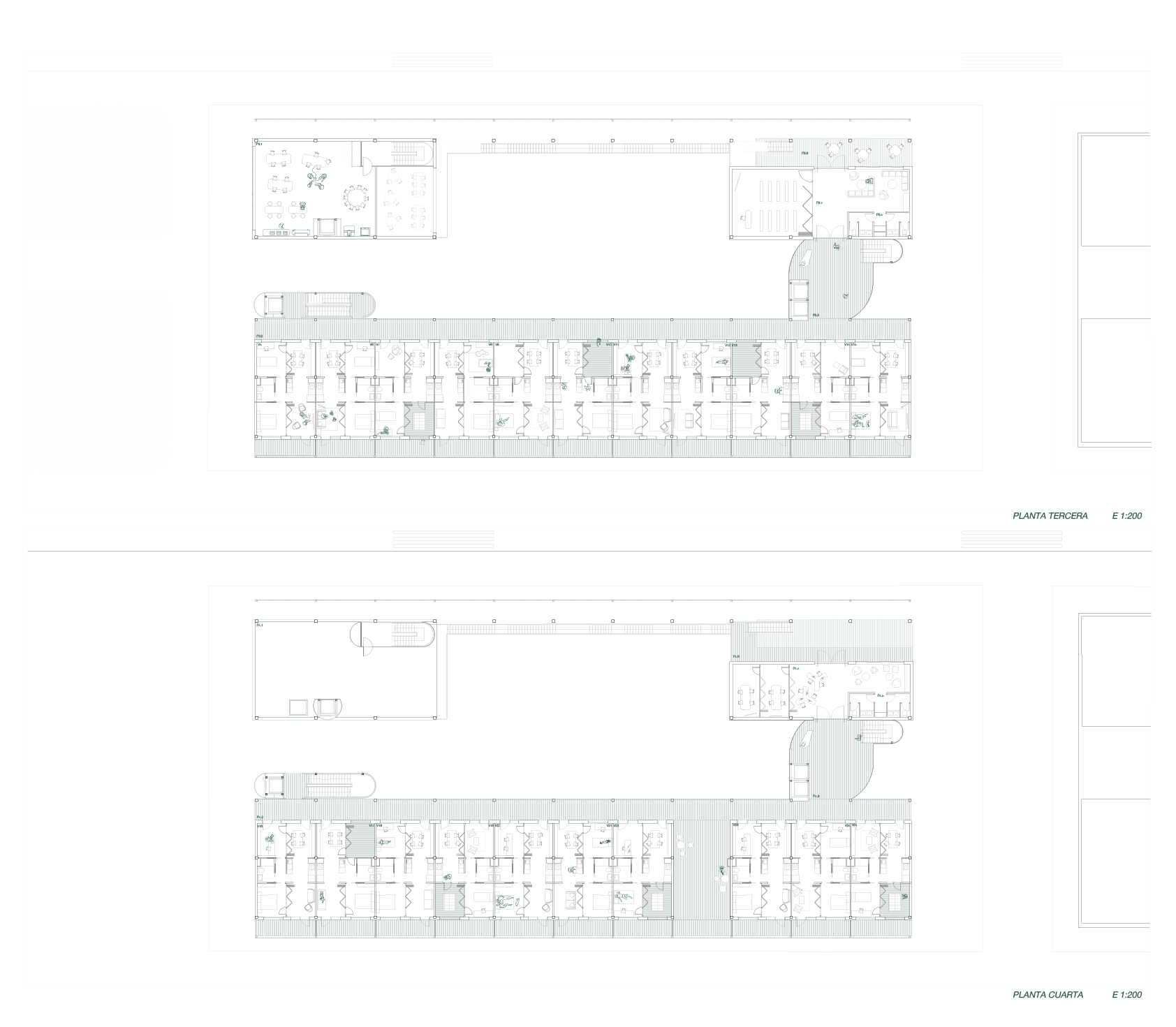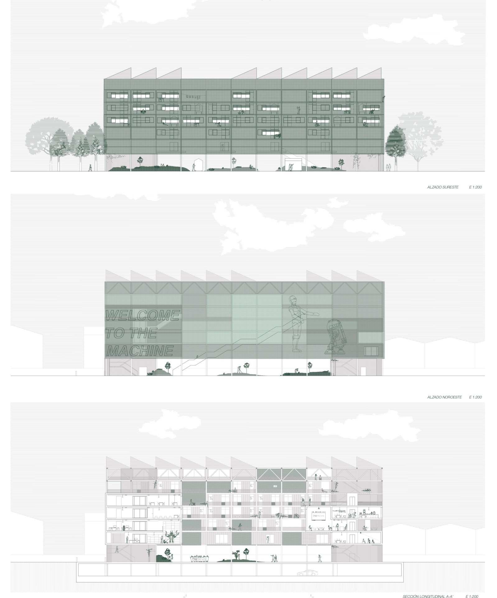 El edificio se desarrolla en dentro de este espacio máquina que unifica la piel textil, donde se establecen tres volúmenes diferenciados en usos, pero relacionados estrechamente entre sí. El volumen principal corresponde a las viviendas de los usuarios con viviendas con capacidad adaptativa y configurable, ubicando en la zona superior una zona de cultivos hidropónicos. El volumen comunitario propicia el intercambio social entre los usuarios de la máquina, mientras que el volumen público genera un entorno de investigación, creación y culturización a través de la tecnología.